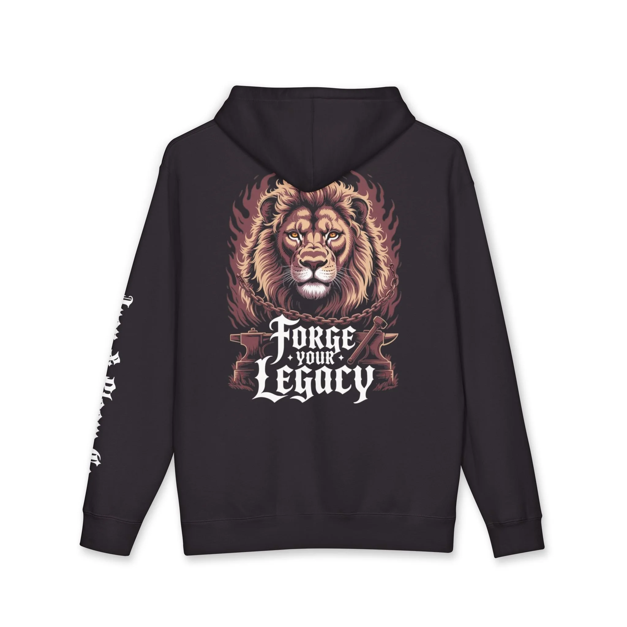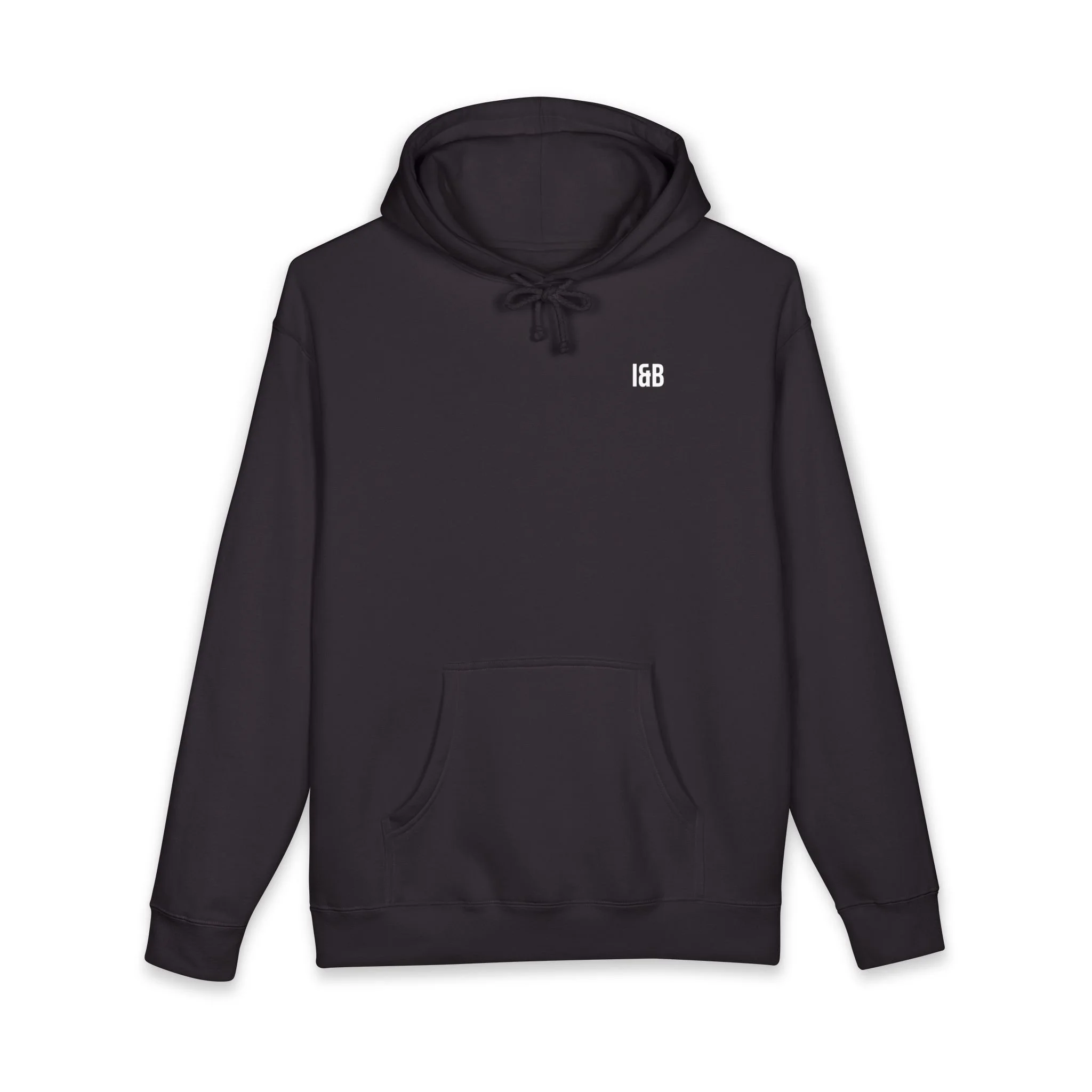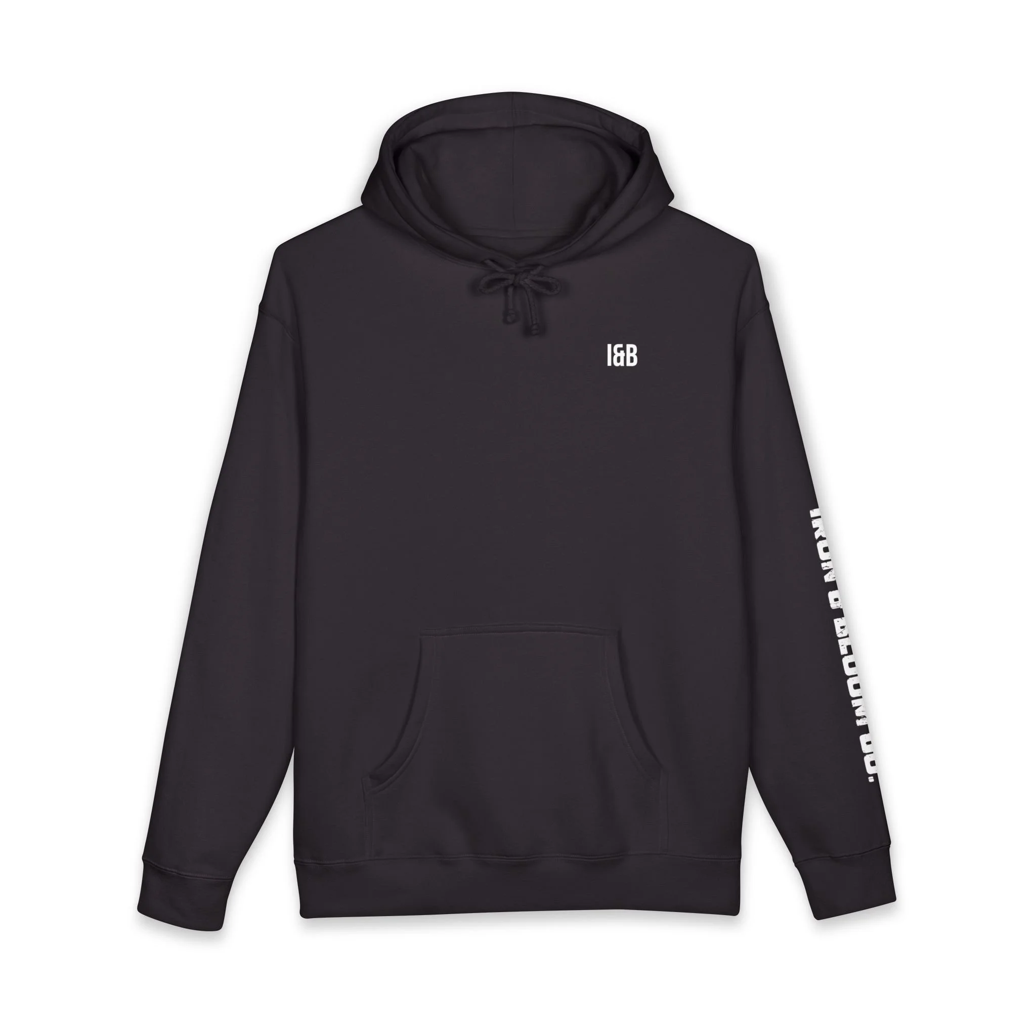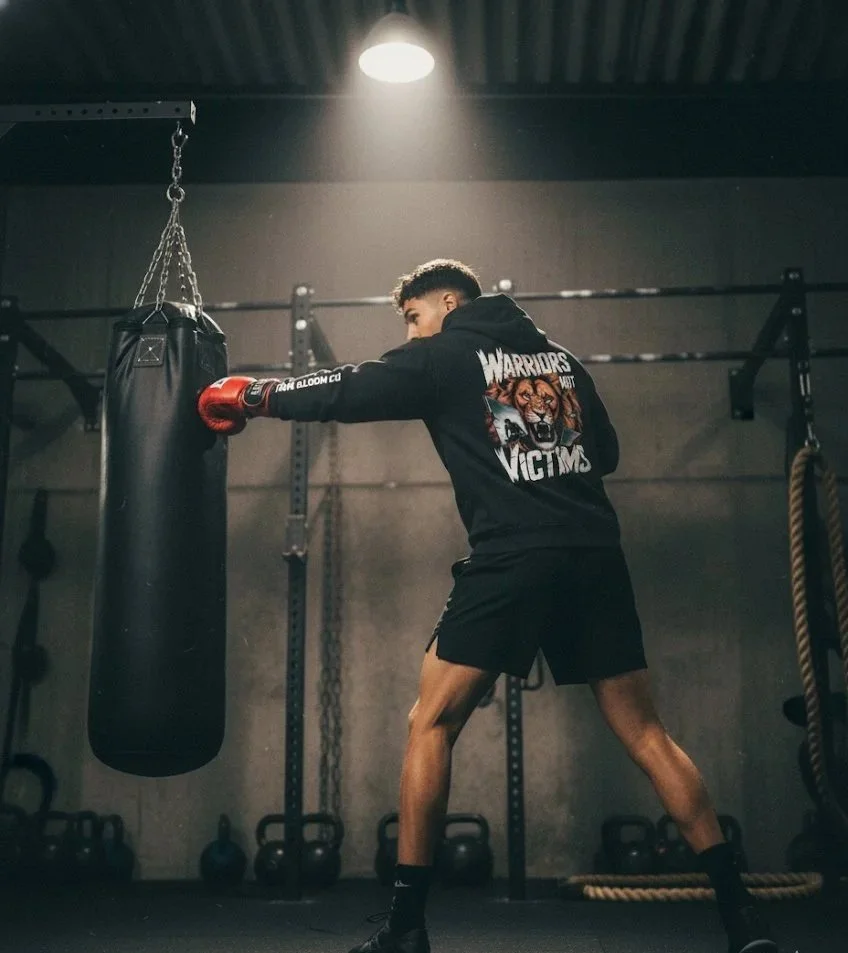 A man wearing a black hoodie and shorts practicing boxing in a gym, punching a hanging black punching bag.